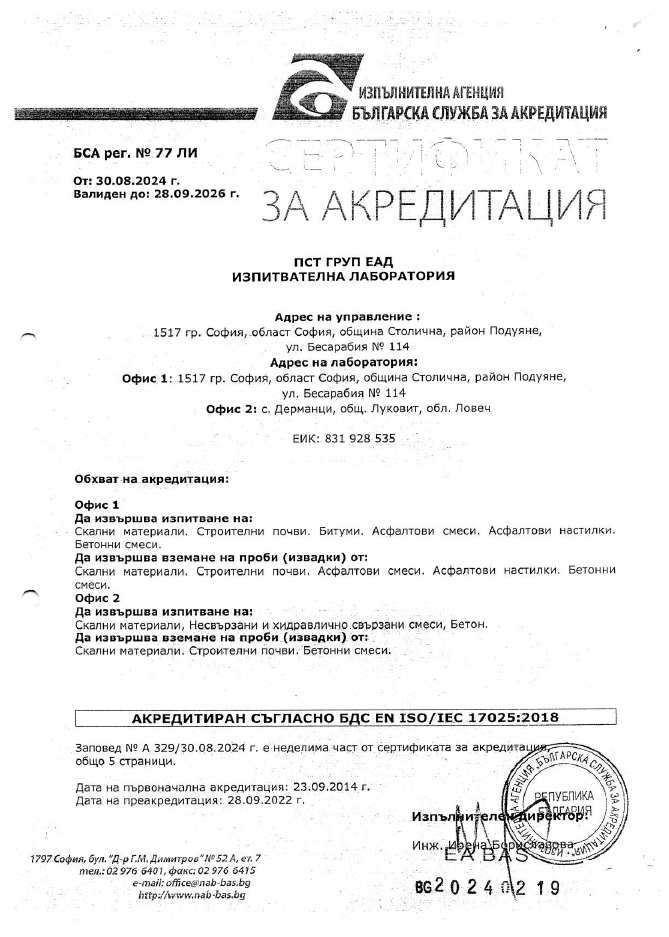От бутона ПРОЧЕТИ ПОВЕЧЕ можете да се запознаете по-подробно със стандартизираните методи от акредитирания гъвкав обхват на изпитвателната лаборатория. Лабораторията осигурява изпитвания съгласно българските и международните стандарти, включително БДС и AASHTO, като резултатите от тези тестове се използват за контрол на качеството на строителните материали в различни инфраструктурни проекти.